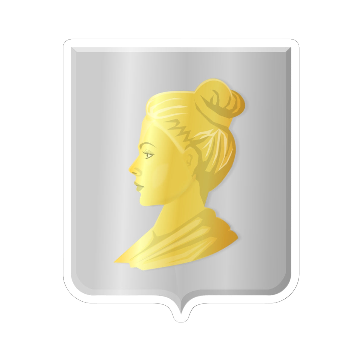 The central element of the design is a golden (yellow) bust of a woman set against a silver (white) background. The woman faces the heraldic right, appearing to the viewer's left. This is the prominent feature of the design.