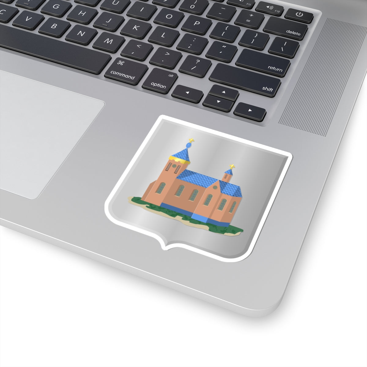 The primary element of the design is a church depicted on a shield. The church's design follows the heraldic rule of "argent a church," meaning a church on a silver (white) background.
