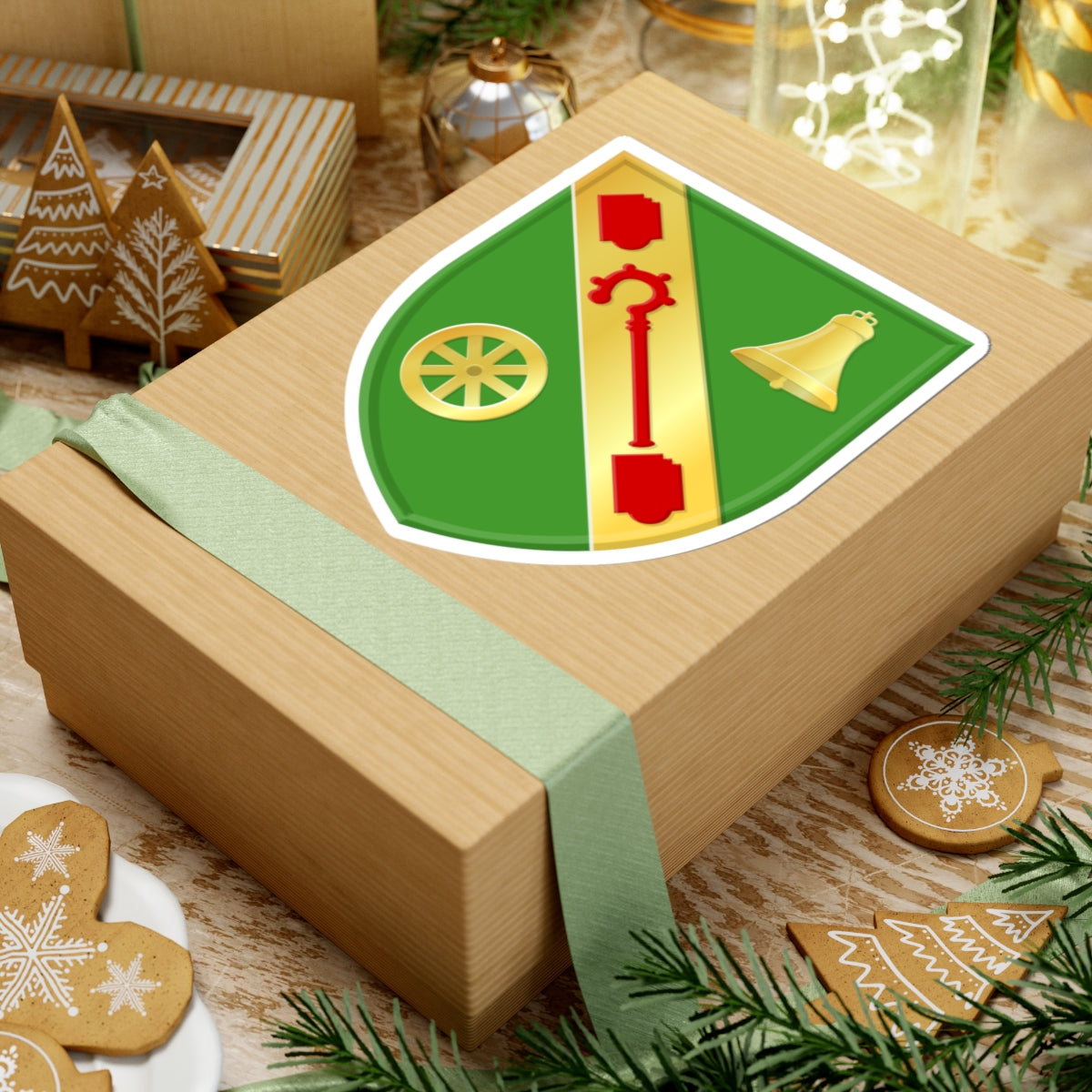 The central element is a shield, its backdrop a verdant green field, mirroring the village's surrounding landscape. A bold gold (yellow) diagonal band sweeps across the shield, from upper right to lower left. This band provides a stage for the main symbols.