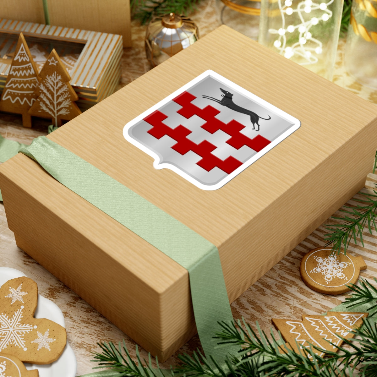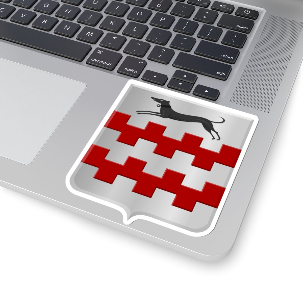 In the "chief," or upper section, of the shield, there is a prominent running greyhound. This elegant canine figure is depicted in black (sabel in heraldic terminology), adding a bold contrast to the overall design. While the origins of the dog symbol are somewhat mysterious, it's a key element of the Acquoy coat of arms.