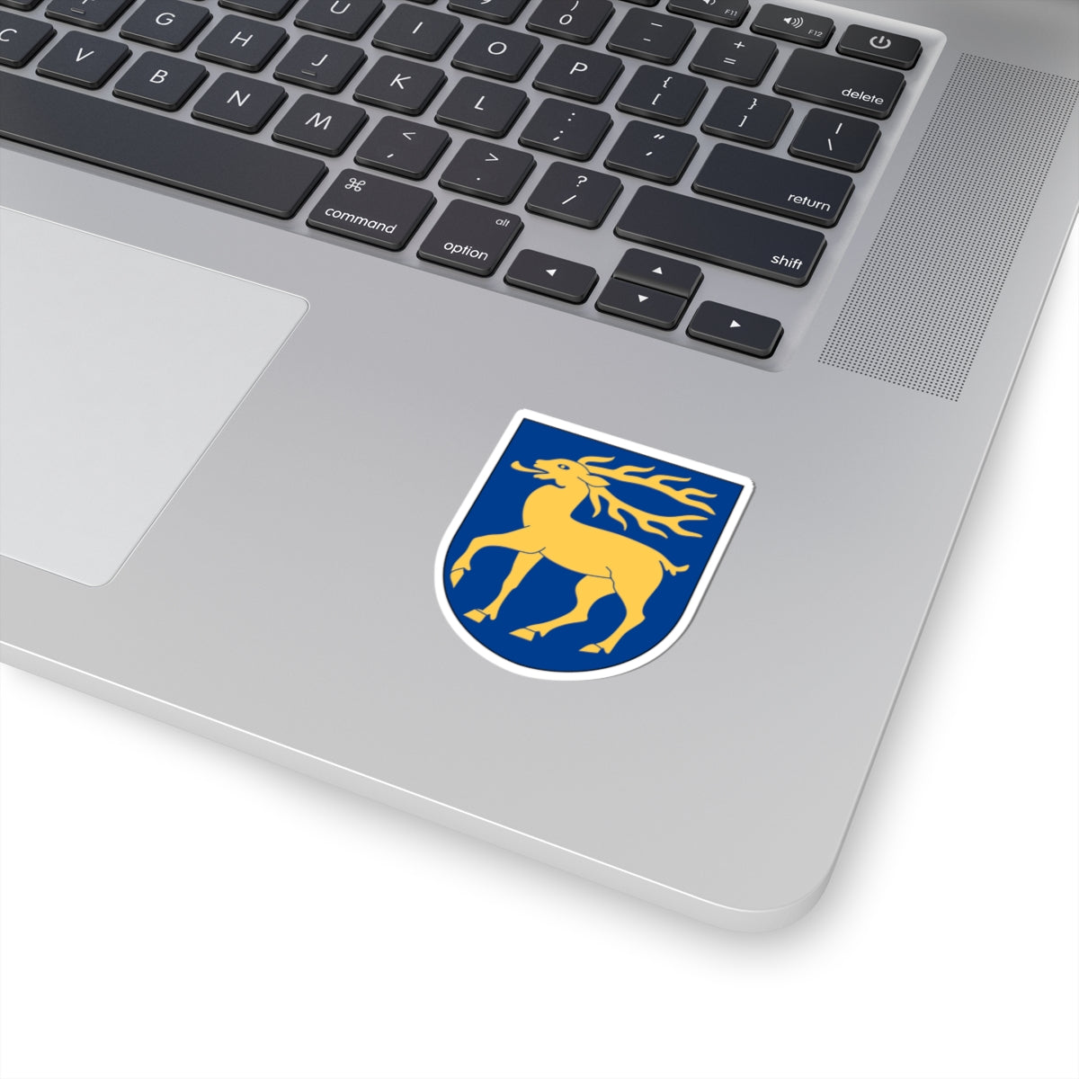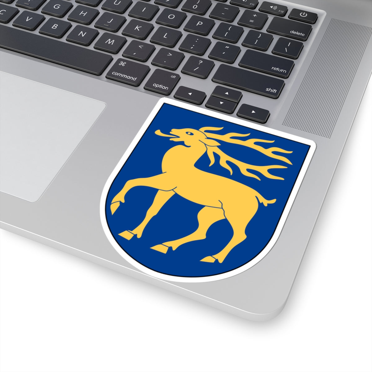 This decal showcases the striking Åland vapen, the coat of arms representing the autonomous region of Åland, Finland. The design centers around a vibrant red shield, the backdrop for a prominent golden (yellow) red deer.