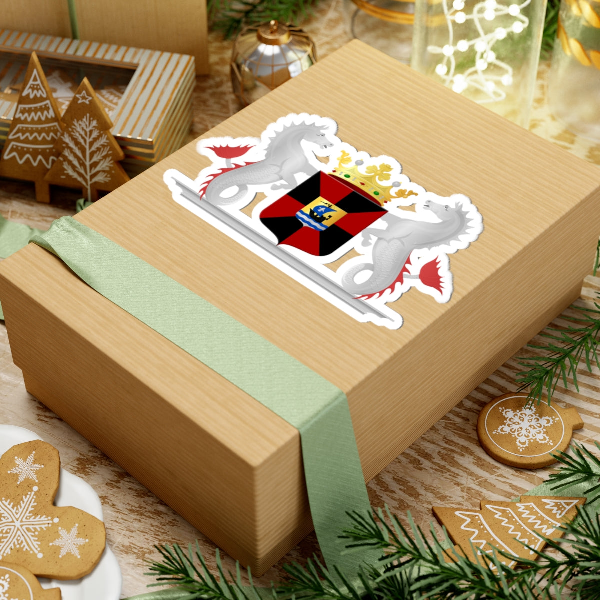 Flanking the shield are two heraldic sea-horses, stylized creatures combining elements of both horses and fish. They serve as supporters, symbolizing Almere's historical and geographical relationship with water. Above the shield, a golden crown is placed, adorned with three leaves and two pearls, a traditional heraldic emblem signifying municipal authority.