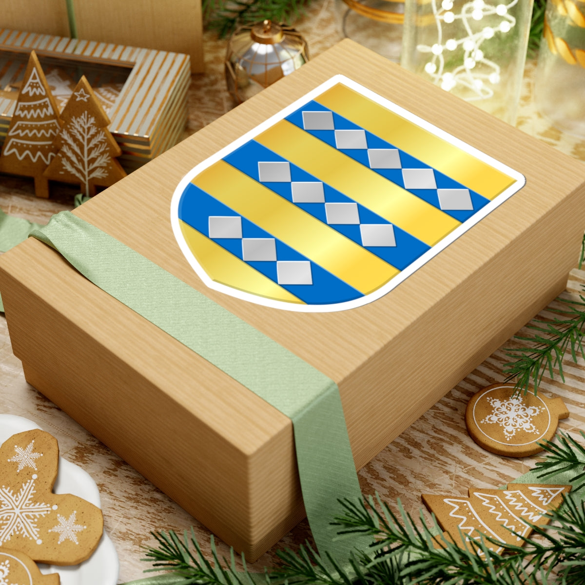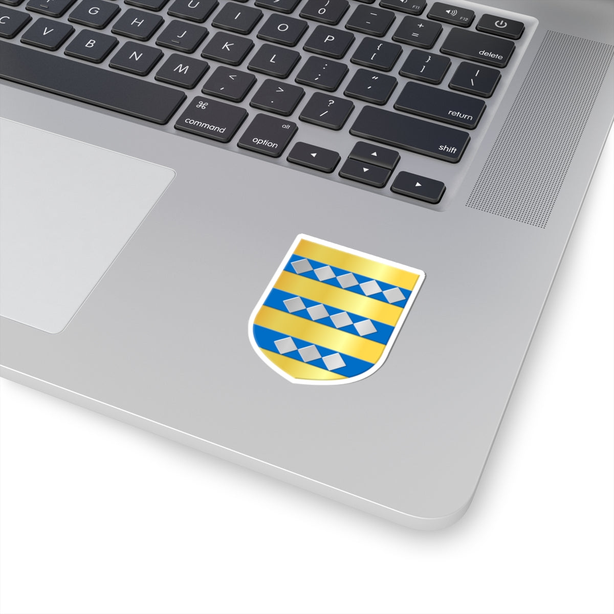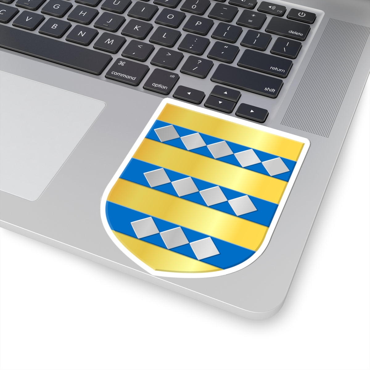 The central element is a gold (or) shield, providing a regal and historical backdrop. Across the shield are three horizontal blue (azure) bars, adding contrast and visual interest. Arranged upon these blue bars are twelve silver (argent) lozenges, or diamond shapes, in a specific configuration: five on the top bar, four on the middle bar, and three on the bottom bar.