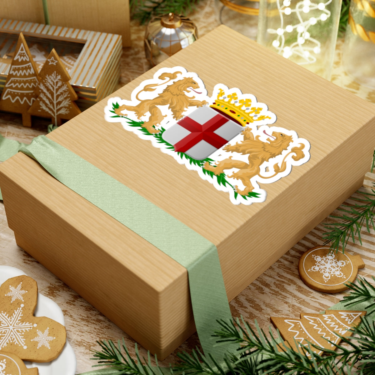 Flanking the shield are two powerful lions, depicted in their natural brown color, posed in a rampant (climbing) position, with tongues of fiery red. The lions act as guardians, reinforcing the visual strength and heraldic tradition of the design.