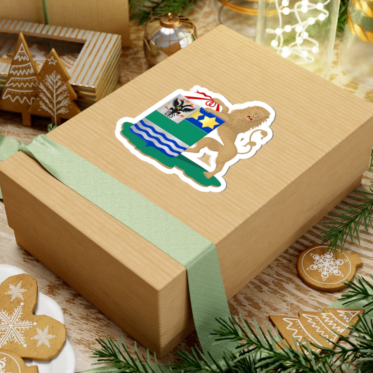 A natural-colored lion stands on the left side, serving as a heraldic supporter, adding to the visual impact and prestige of the design.