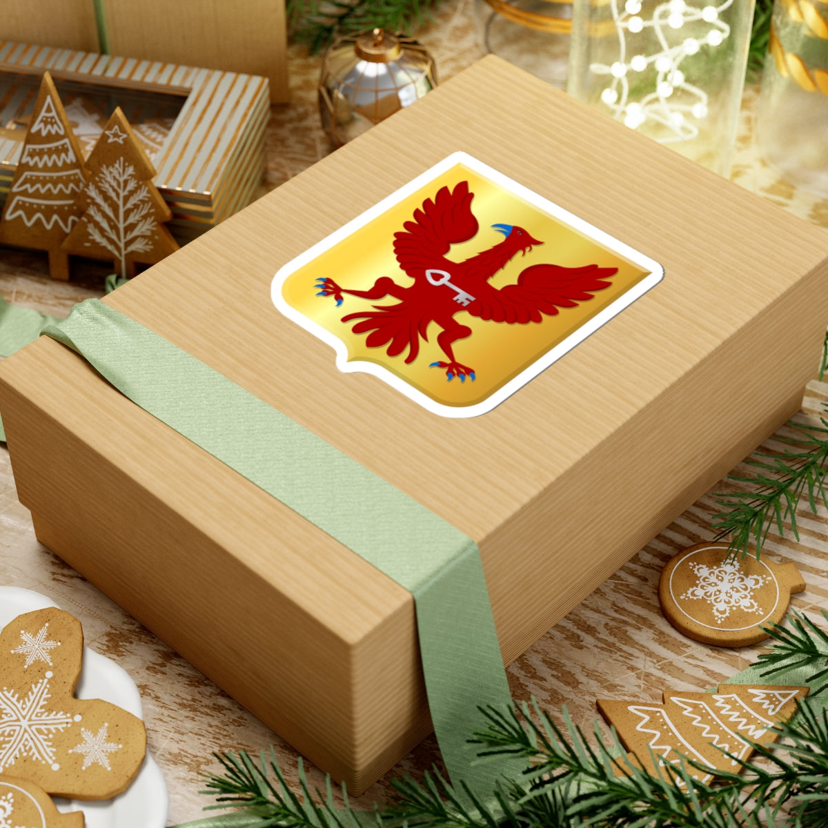 The central design is a shield, rendered in a striking gold (or) field. Dominating the shield is a majestic red (gules) eagle, its wings dramatically spread (“displayed”), conveying a sense of power and prominence. The eagle’s beak and claws (nails) are meticulously detailed in a contrasting blue (azure), adding a touch of visual complexity. At the eagle's breast is a silver (argent) key, adding a subtle touch of elegance and mystery.