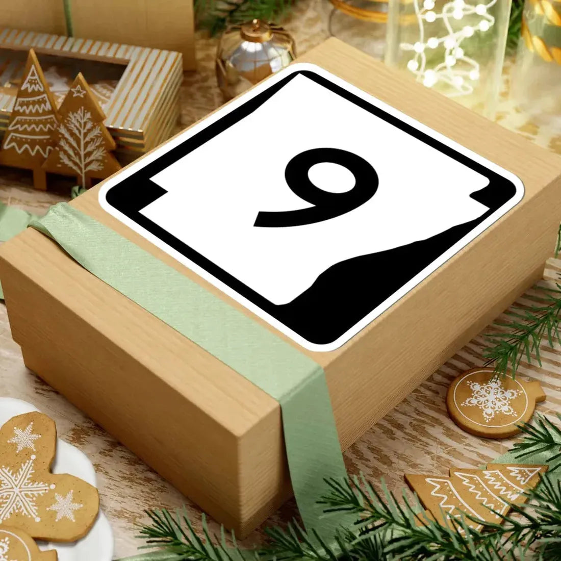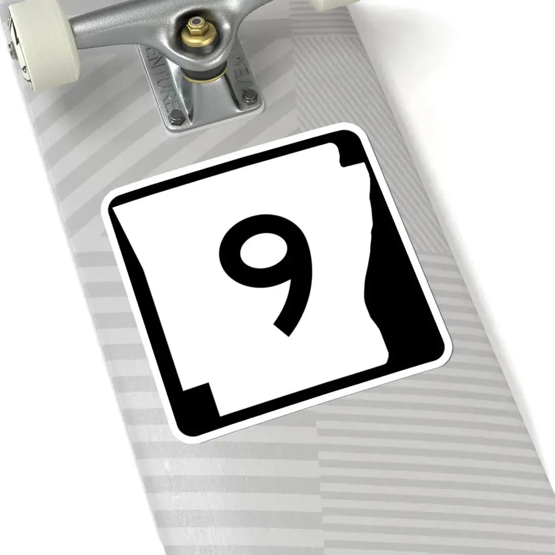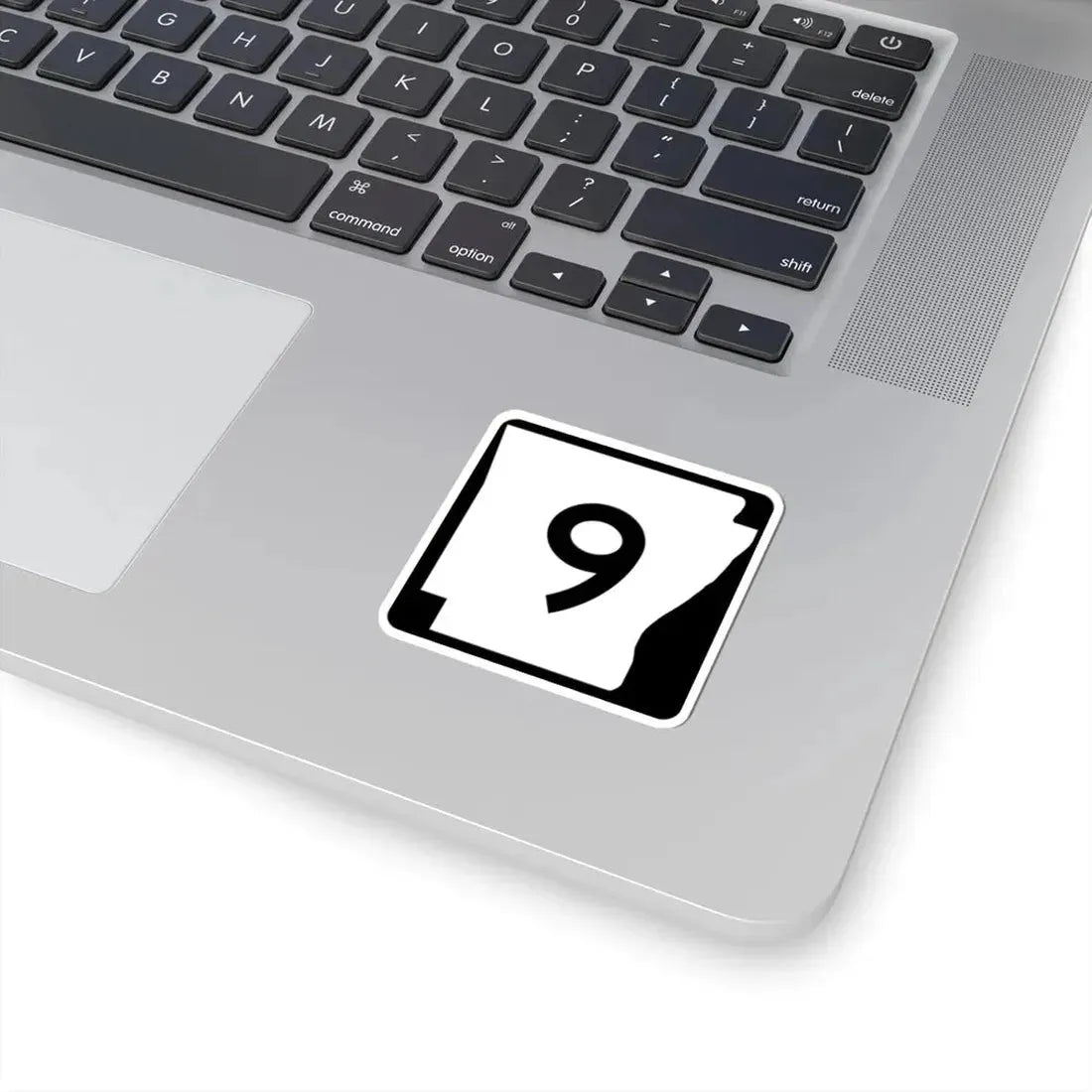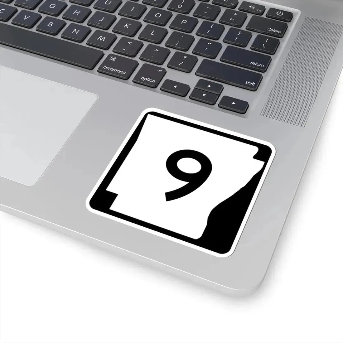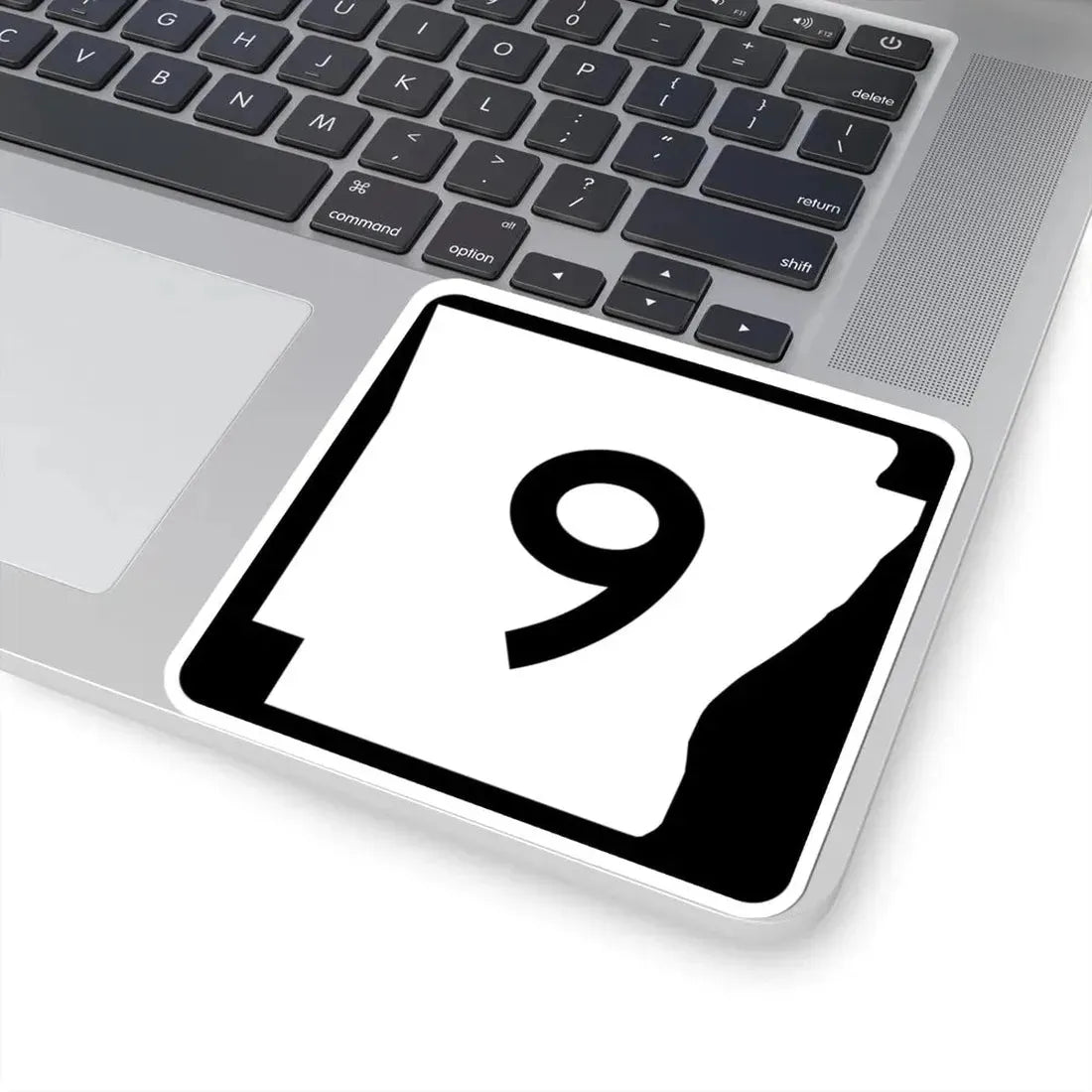 This decal features the instantly recognizable route marker for Arkansas State Highway 9. The design utilizes a bold, clear visual language to convey its meaning.