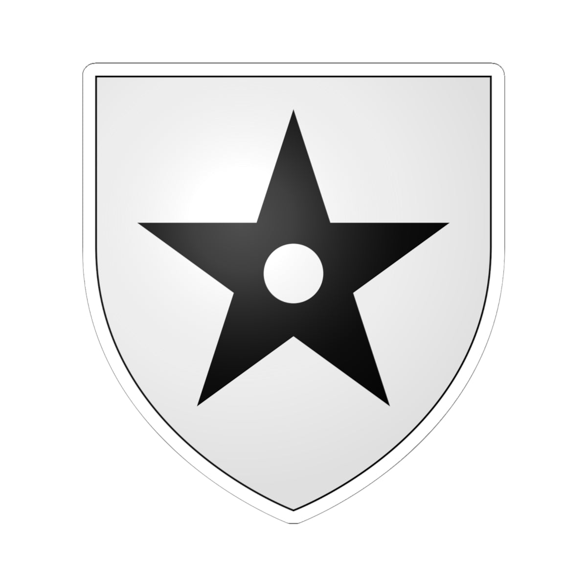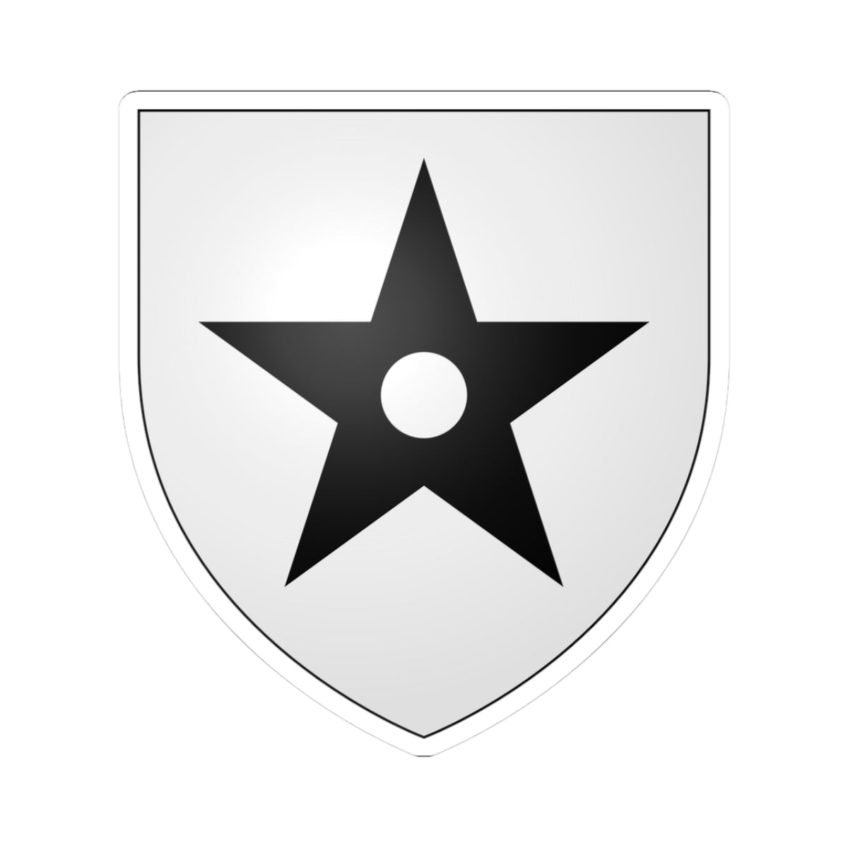 Upon this field is placed a bold, black five-pointed star ("mullet sable"). This star is not a solid shape; it is "pierced of the field," meaning a circular hole appears in its center, revealing the silver background.