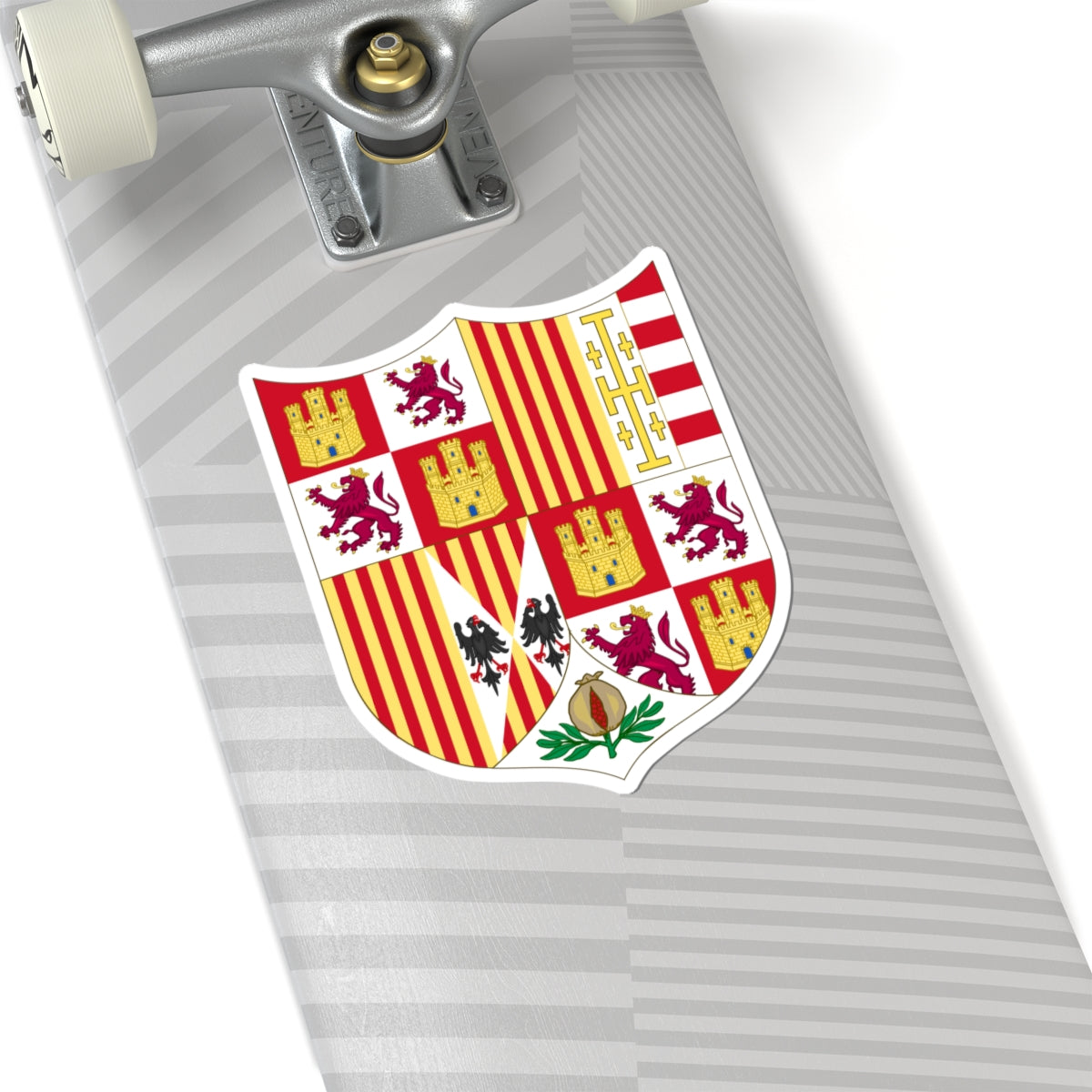 This vinyl decal showcases the intricate and historically rich coat of arms of Ferdinand II of Aragon, a symbol of his rule and the formation of a unified Spain between 1504 and 1513. The design is a captivating visual representation of power, inheritance, and the culmination of significant historical events.