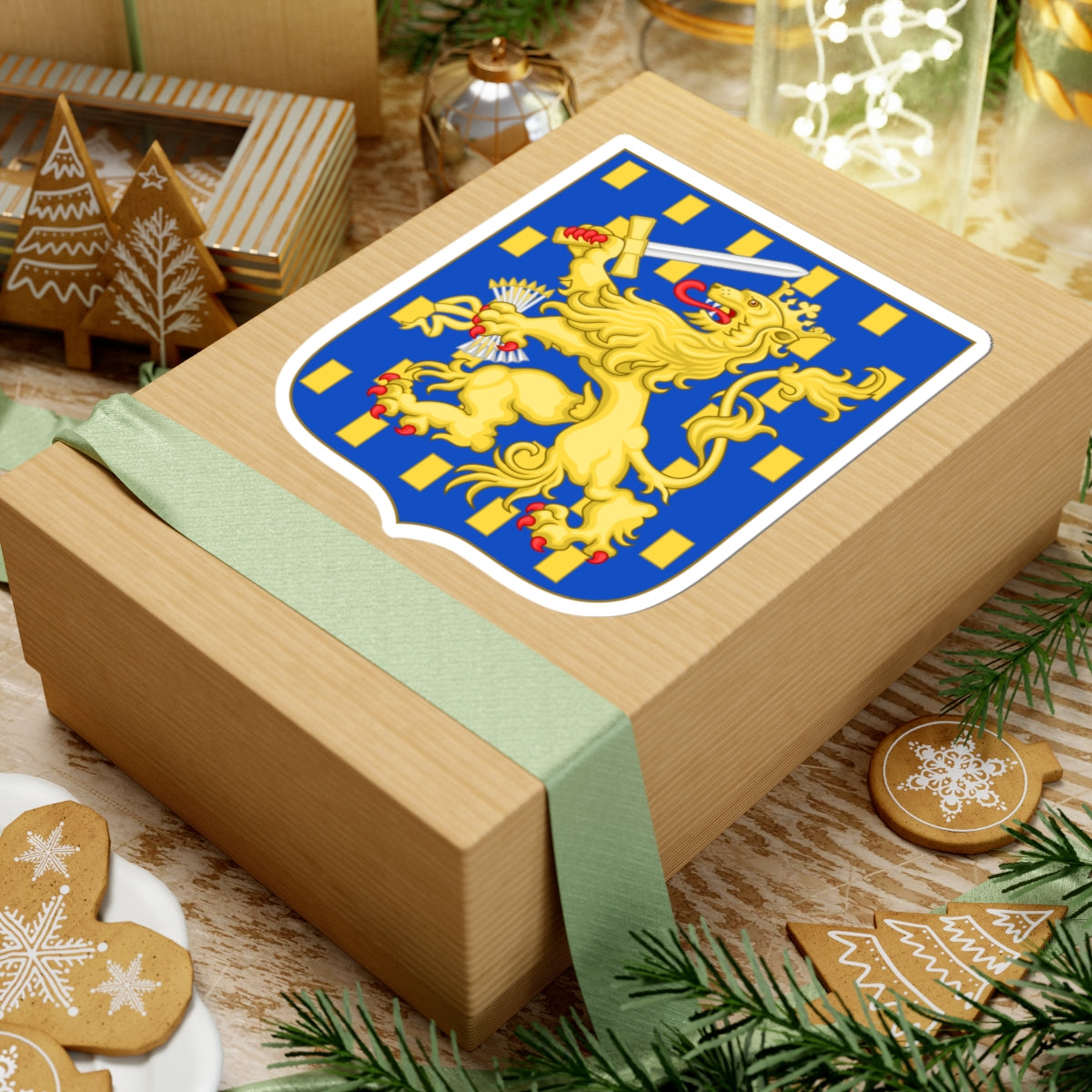 This decal presents the magnificent Arms of the Kingdom of the Netherlands, a powerful visual representation of Dutch history and sovereignty. The design is centered around a striking blue shield, the azure escutcheon, upon which a golden lion rampant dominates the space. This lion, rendered in meticulous detail, stands proudly on its hind legs, its red tongue and claws adding a bold accent. In its right paw, the lion wields a sword, a symbol of defense and justice, while its left paw clutches a bundle of seven arrows, a poignant emblem of unity among the seven provinces that forged the original Dutch Republic.