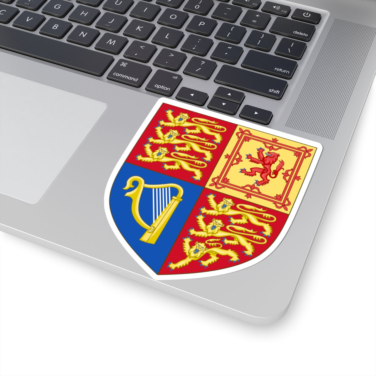 This striking decal features the iconic Arms of the United Kingdom, a heraldic masterpiece representing the rich history and diverse kingdoms that make up the UK. The central element is the quartered shield, or escutcheon, meticulously designed to reflect the nation's heritage.