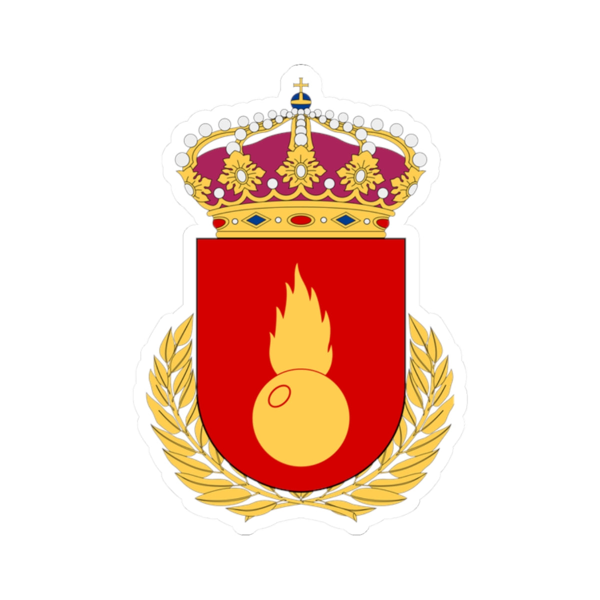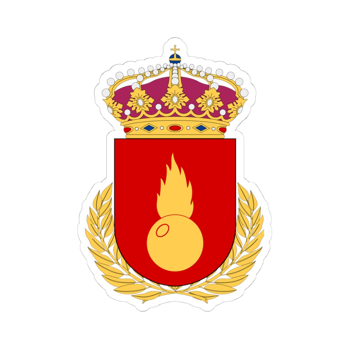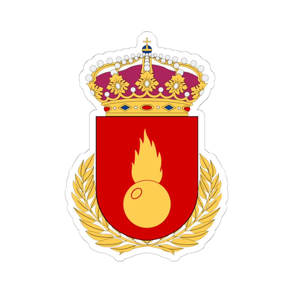 The central element is a shield, emblazoned with a vivid red background. Upon this field rests a golden, flaming grenade. The grenade, depicted in detail, is the focal point, with its flames signifying explosive power and energetic force. Surrounding the shield is a golden laurel wreath, meticulously rendered with its leaves artfully arranged. This wreath symbolizes victory, honor, and achievement.