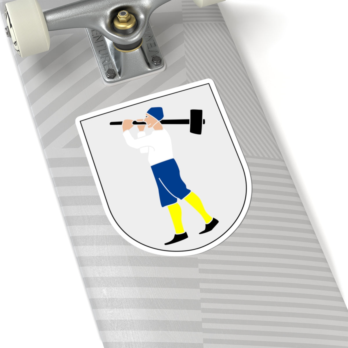 This striking decal features the coat of arms (vapen) of Askersund, Sweden, a design steeped in history and symbolic meaning. The central figure is a blacksmith, depicted in his natural skin tone, a departure from traditional heraldic conventions.