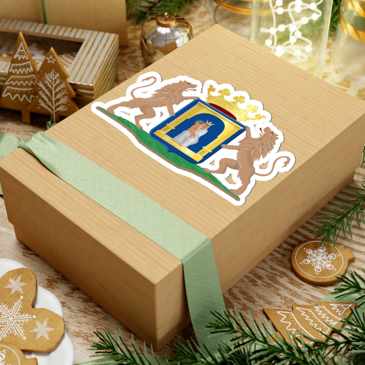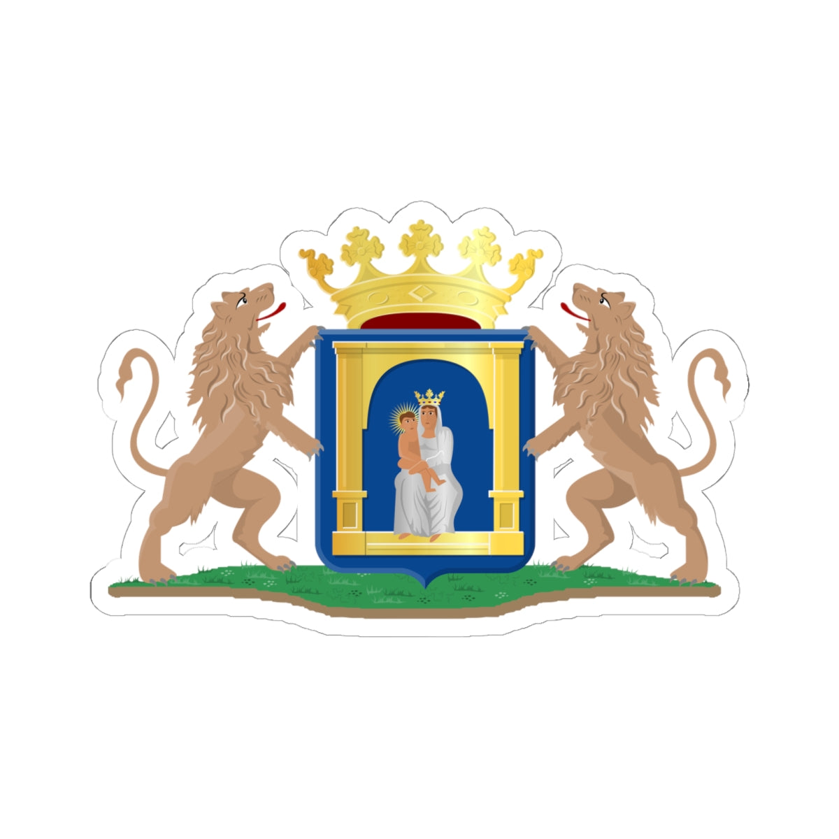 This decal showcases the distinguished coat of arms (wapen) of Assen, Netherlands. The central element is a blue shield (“azure”) bearing a striking image of the Virgin Mary, depicted seated between two golden columns.