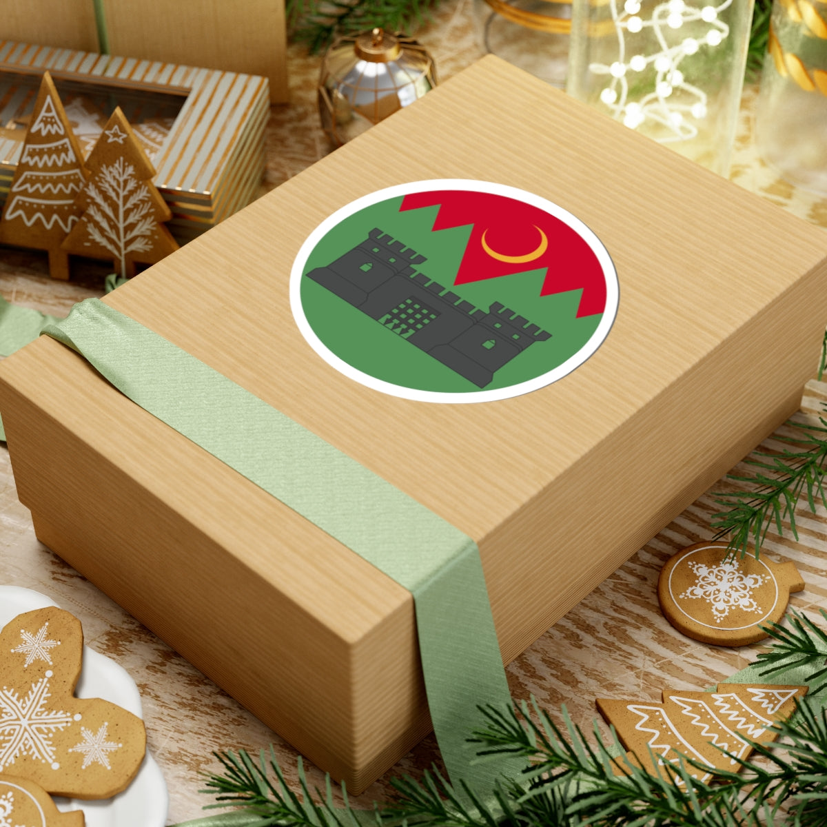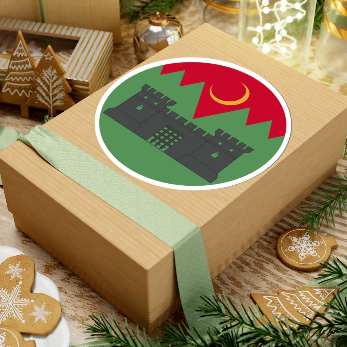 This sticker features a striking design based on the historic badge of the British North-West Frontier Province (NWFP), a heraldic emblem from the colonial era of British India.