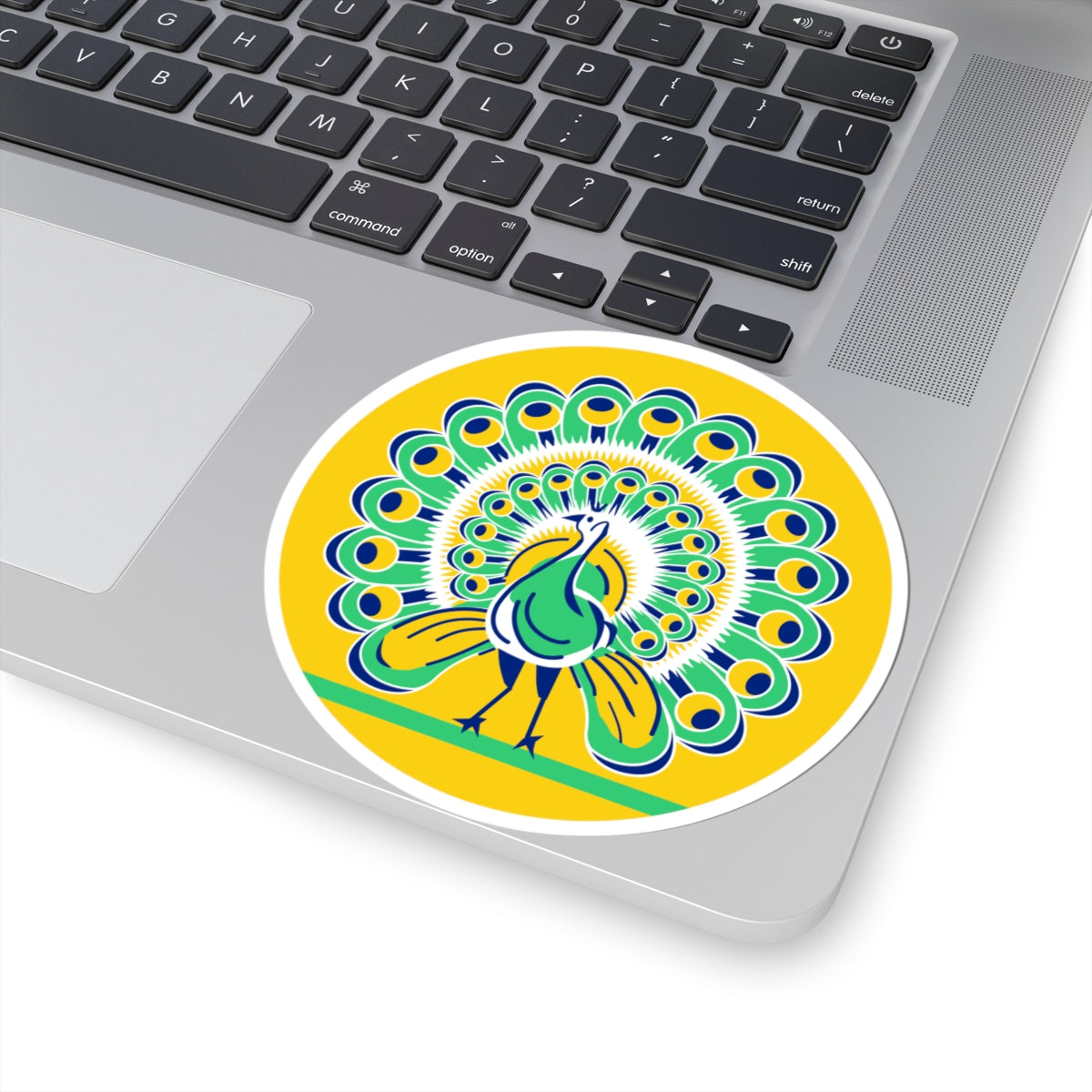 At the heart of the design is a vibrant peacock, presented in full display. The peacock is rendered on a circular field of yellow, also known as gold in heraldry. The peacock's majestic posture is emphasized, offering a proud and noble appearance.
