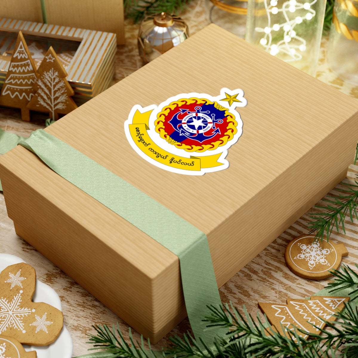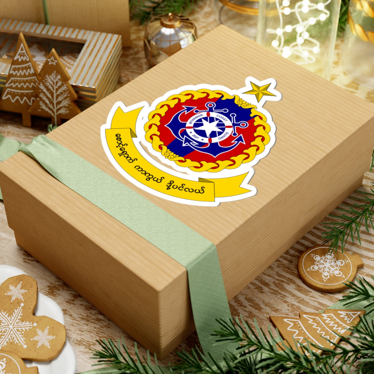 The central emblem is encased within a golden rope or wreath, symbolizing unity, strength, and the traditions of the sea. Crowning the emblem is a radiant gold five-pointed star, possibly representing rank, status, or a link to national symbolism. Beneath the emblem, a scroll bearing Burmese script completes the design, adding a distinct cultural touch.
