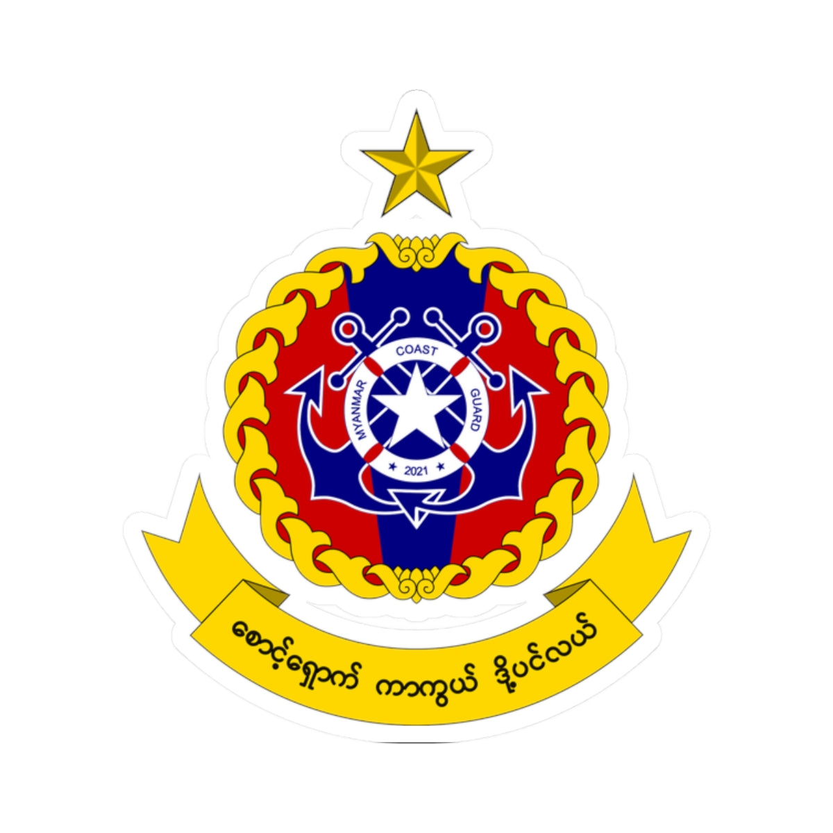 At the heart of the design, two crossed anchors boldly declare the Coast Guard's naval mission. A central dark blue circular area cradles a pristine white star, a representation of guidance or national identity. Encircling the star is a life ring or lifebuoy, with "Myanmar Coast Guard" and the founding year, "2021", elegantly displayed, emphasizing safety and rescue.