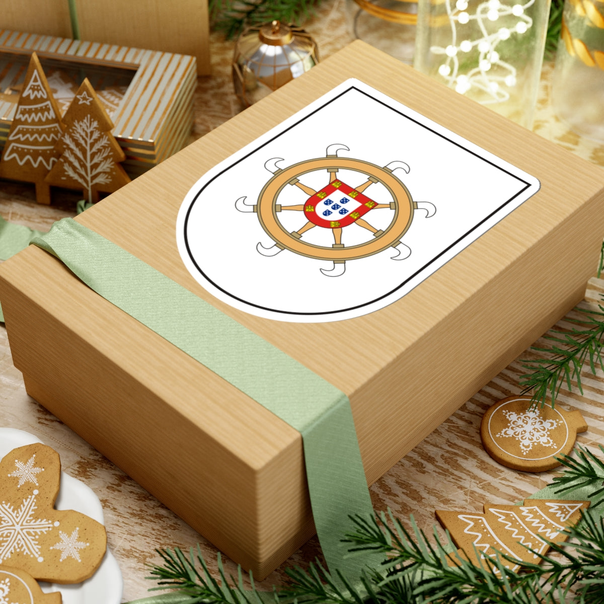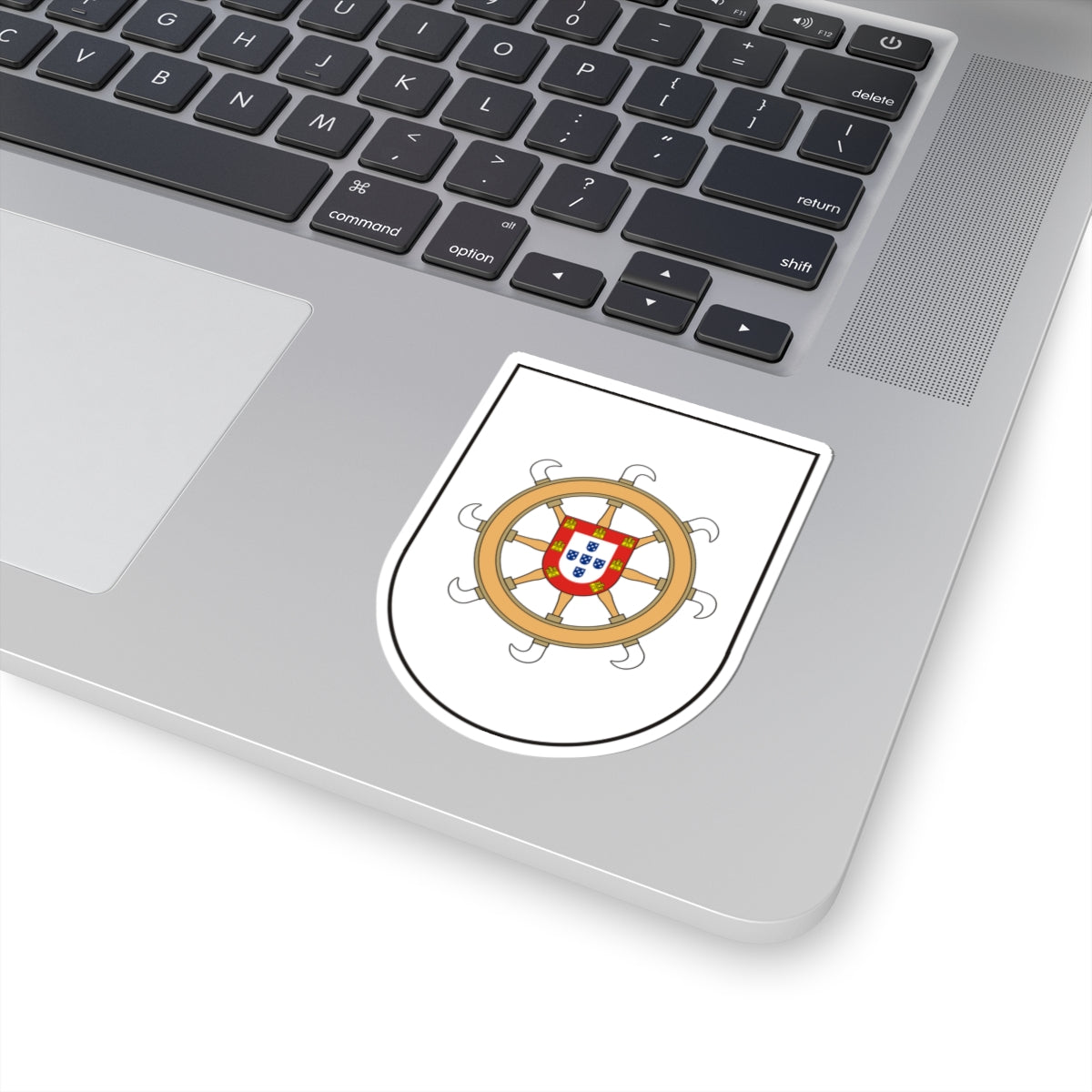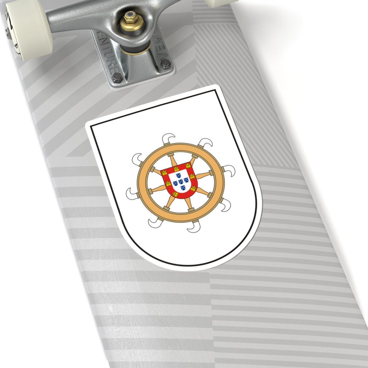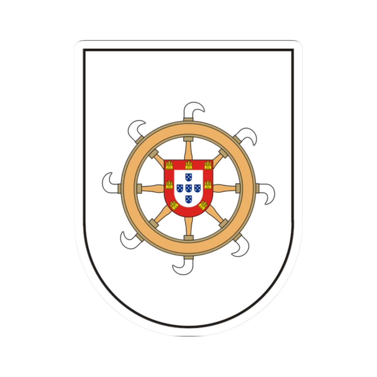 At the heart of the wheel lies the Portuguese shield, a direct reference to the Portuguese royal coat of arms. This shield features five blue escutcheons, each bearing five bezants, and serves as a powerful symbol of Portuguese authority and colonial ties to the region.
