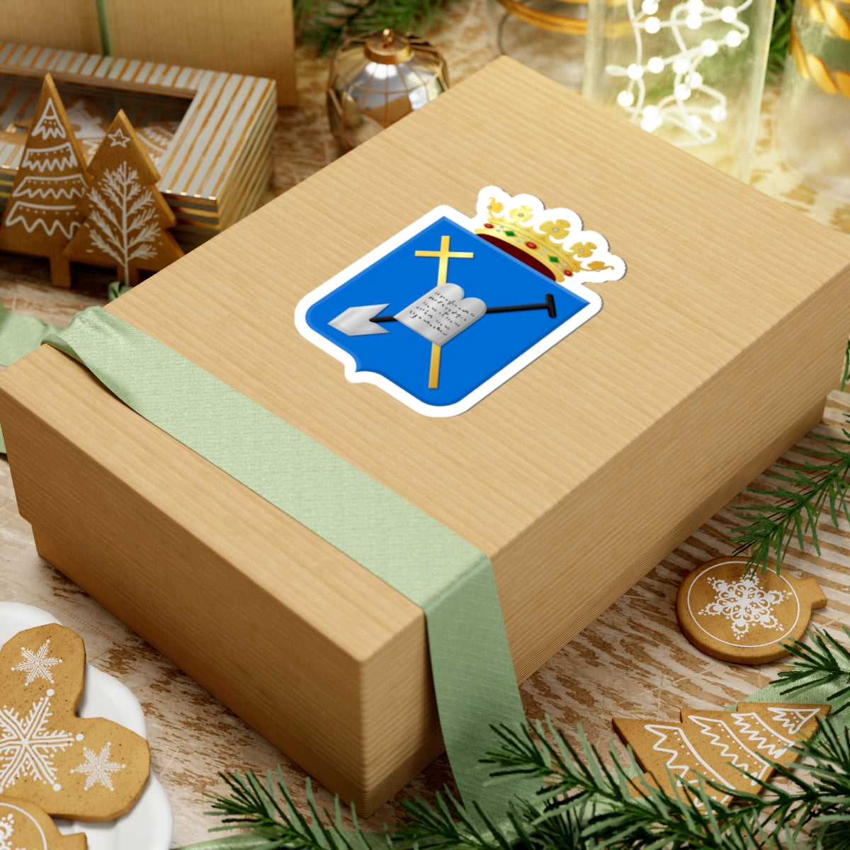 This decal presents the distinguished Coat of Arms of Bedum, a municipality in the northern Netherlands, in a striking visual format. The artwork embodies the town's rich historical and religious heritage through a series of symbolic elements arranged on a traditional heraldic shield.