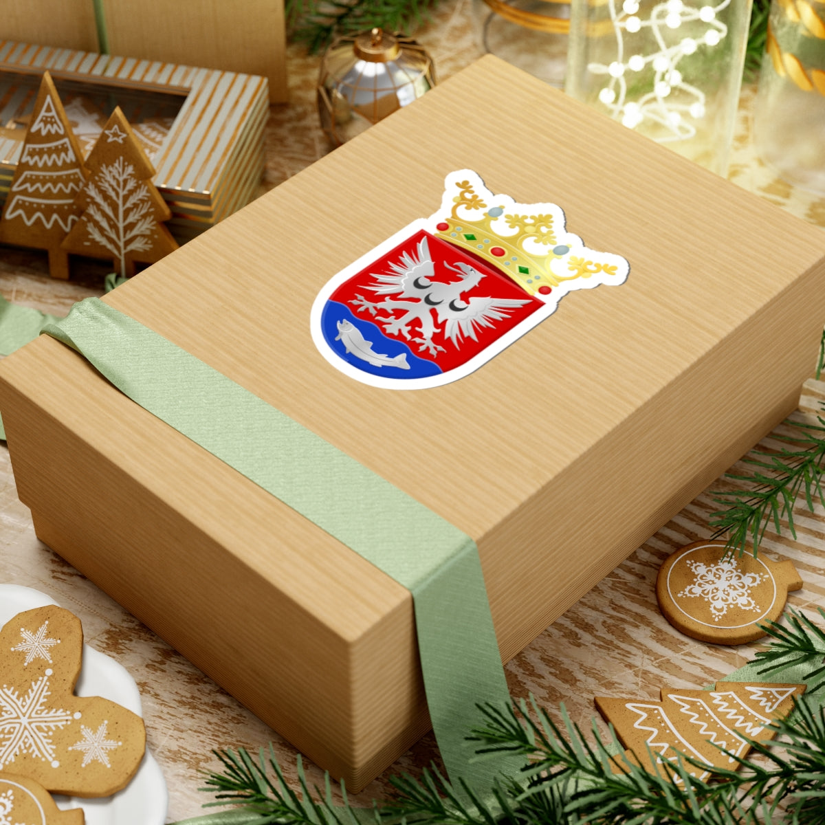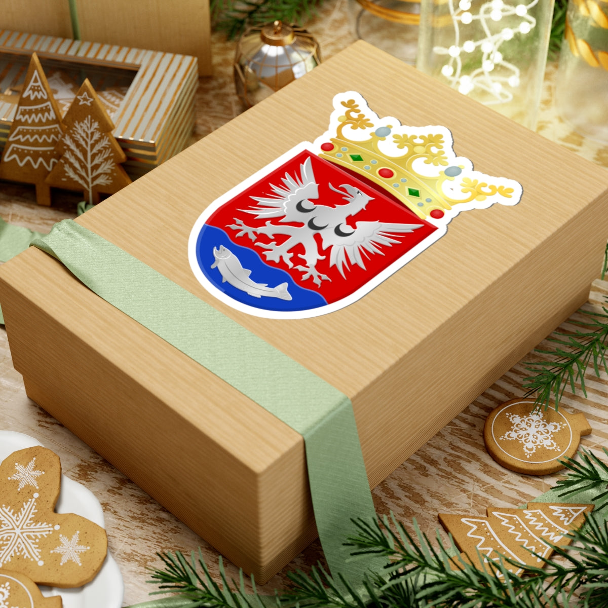 The central element is a shield, known as an escutcheon. It's rendered with a bold red (Gules) background, symbolizing strength and courage. A diagonal silver (Argent) stripe, called a bend, elegantly traverses the shield, running from the upper left to the lower right. This bend represents a connection to prominent noble families of the area.