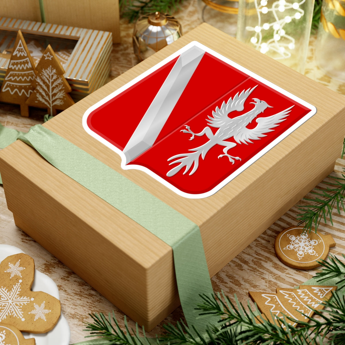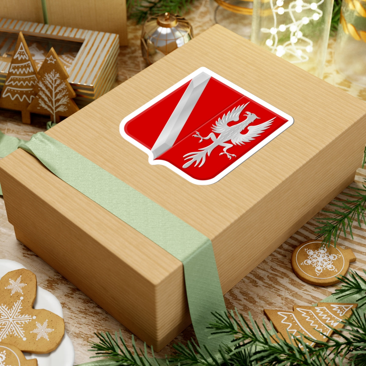 The central element is a bold red shield, a classic heraldic symbol representing strength and courage. Across this field, a diagonal silver (argent) bend gracefully divides the design, a nod to a historical family connection to the region. This stripe adds a visual element of movement and interest.