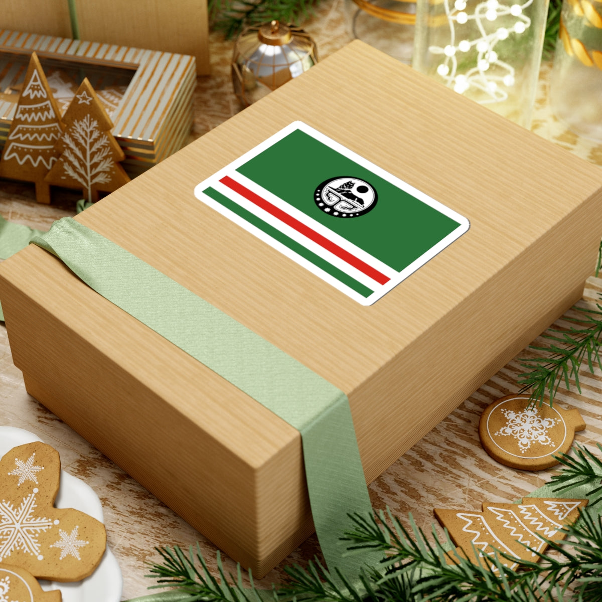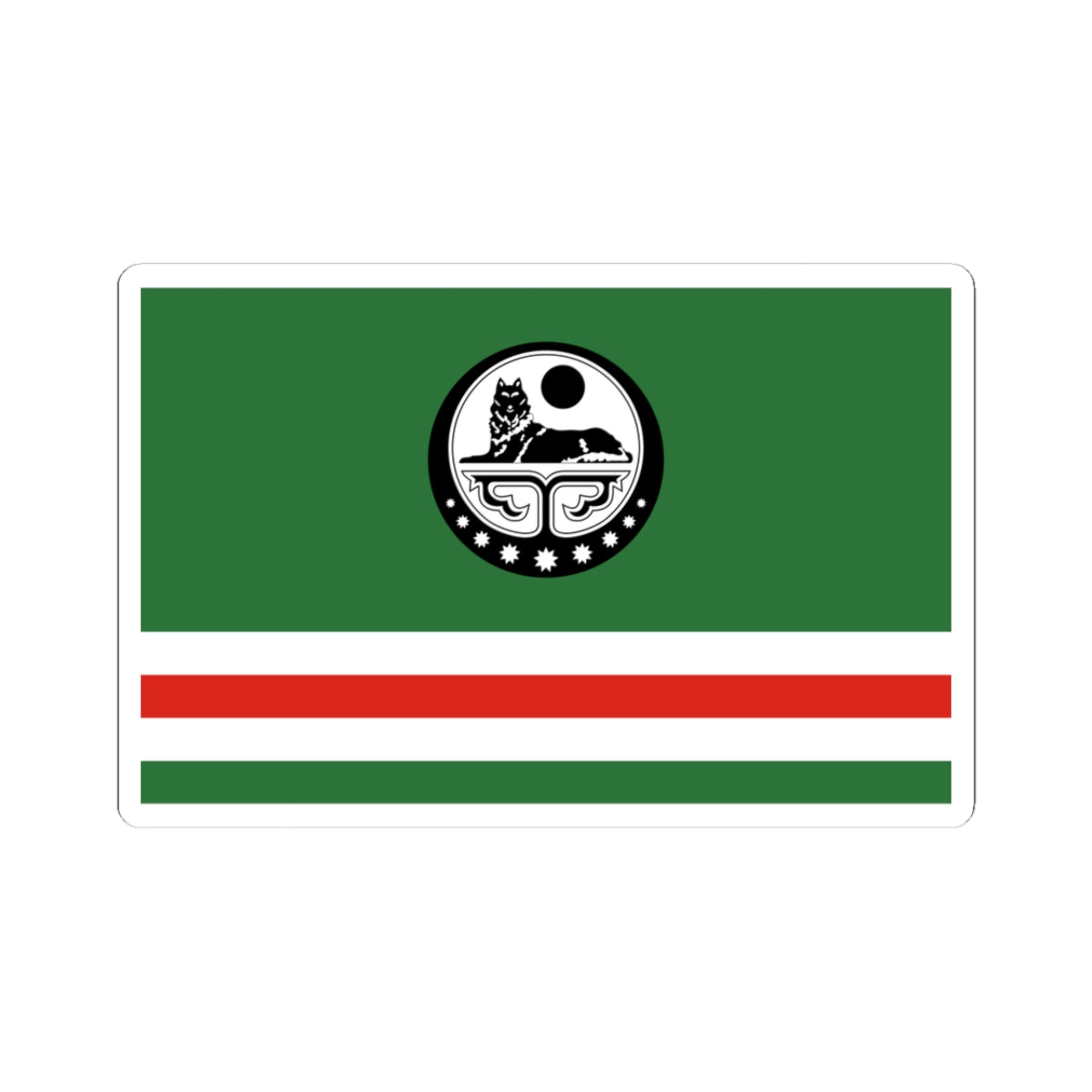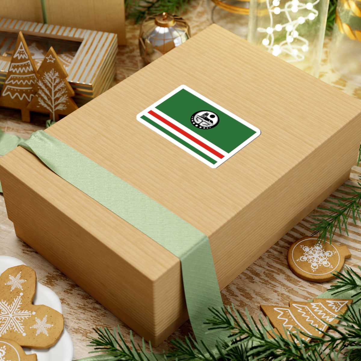 This sticker features a striking visual representation of the historical "Flag of the Chechen Republic of Ichkeria with Coat of Arms." The design centers on the iconic tricolor of the separatist movement: a broad field of green at the top, followed by alternating stripes of white and red near the bottom, culminating in a final green stripe.