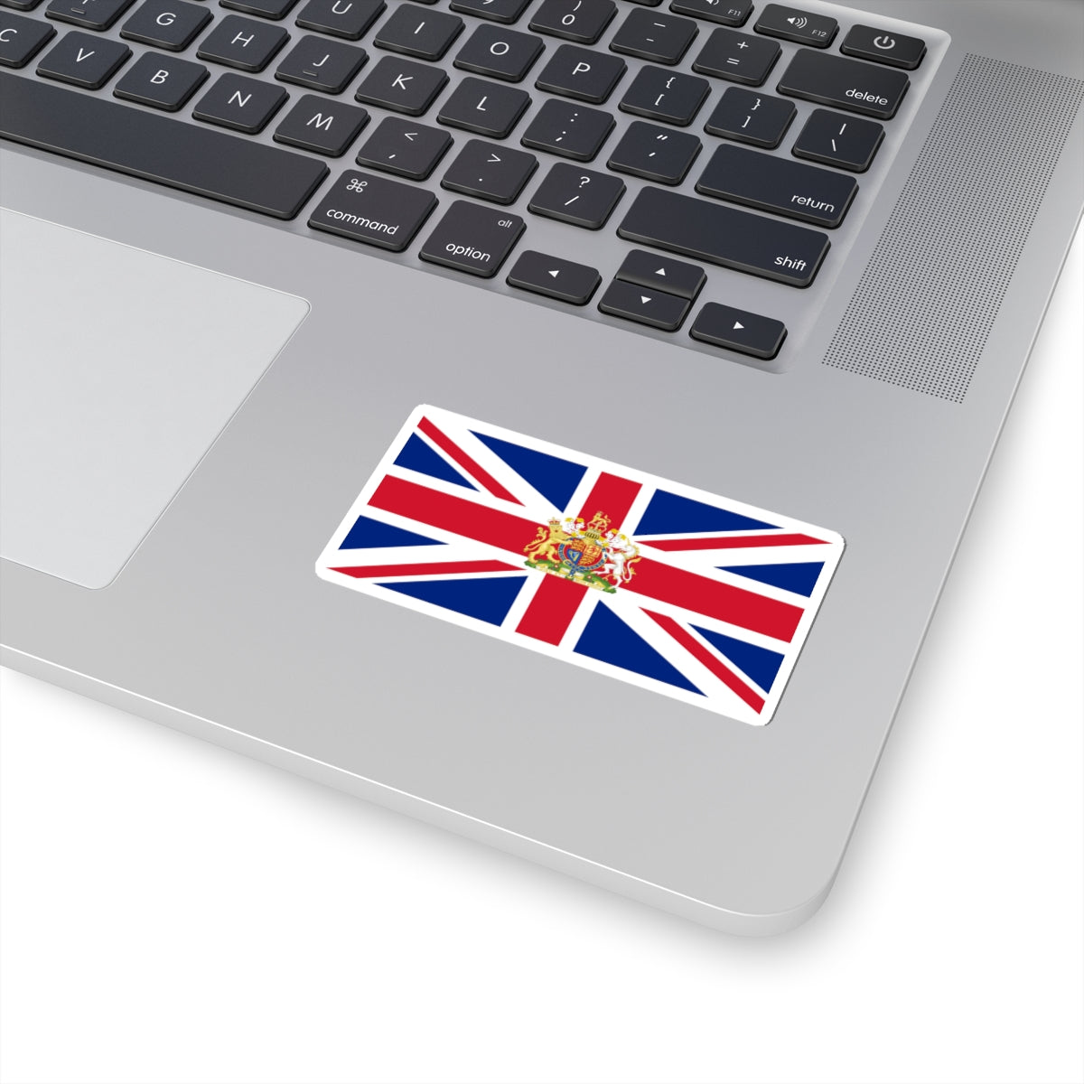 This striking decal presents a significant variant of the iconic Union Jack, the flag of the United Kingdom. It departs from the standard design through the act of "defacement," a vexillological term meaning the addition of a prominent emblem. In this instance, the Royal Coat of Arms of the United Kingdom is centrally imposed upon the familiar Union Jack design.