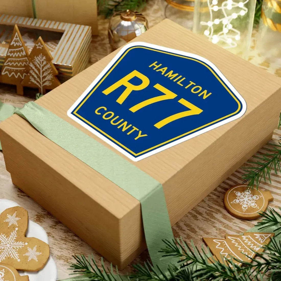 This sticker features the official road sign design for Hamilton County Route R77 in Iowa. The artwork accurately replicates the distinctive visual elements of the route marker used throughout Iowa's county road system.