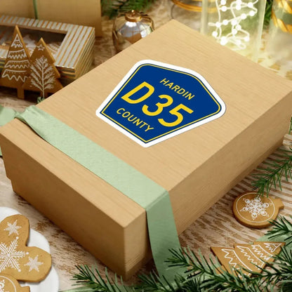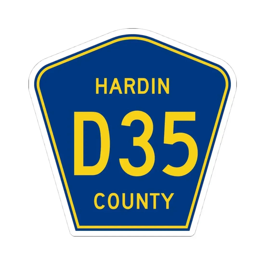 This decal features the instantly recognizable design of the Hardin County Route D35 road sign, a key element of Iowa's county road marker system. The artwork meticulously replicates the official signage found throughout Hardin County.