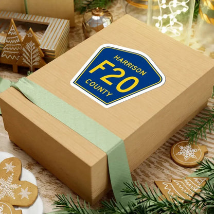 This decal design replicates the iconic look and feel of a road sign marking Harrison County Route F20 in Iowa. The visual centerpiece is a stylized representation of a road sign, instantly recognizable to anyone familiar with American roadways and route markers.