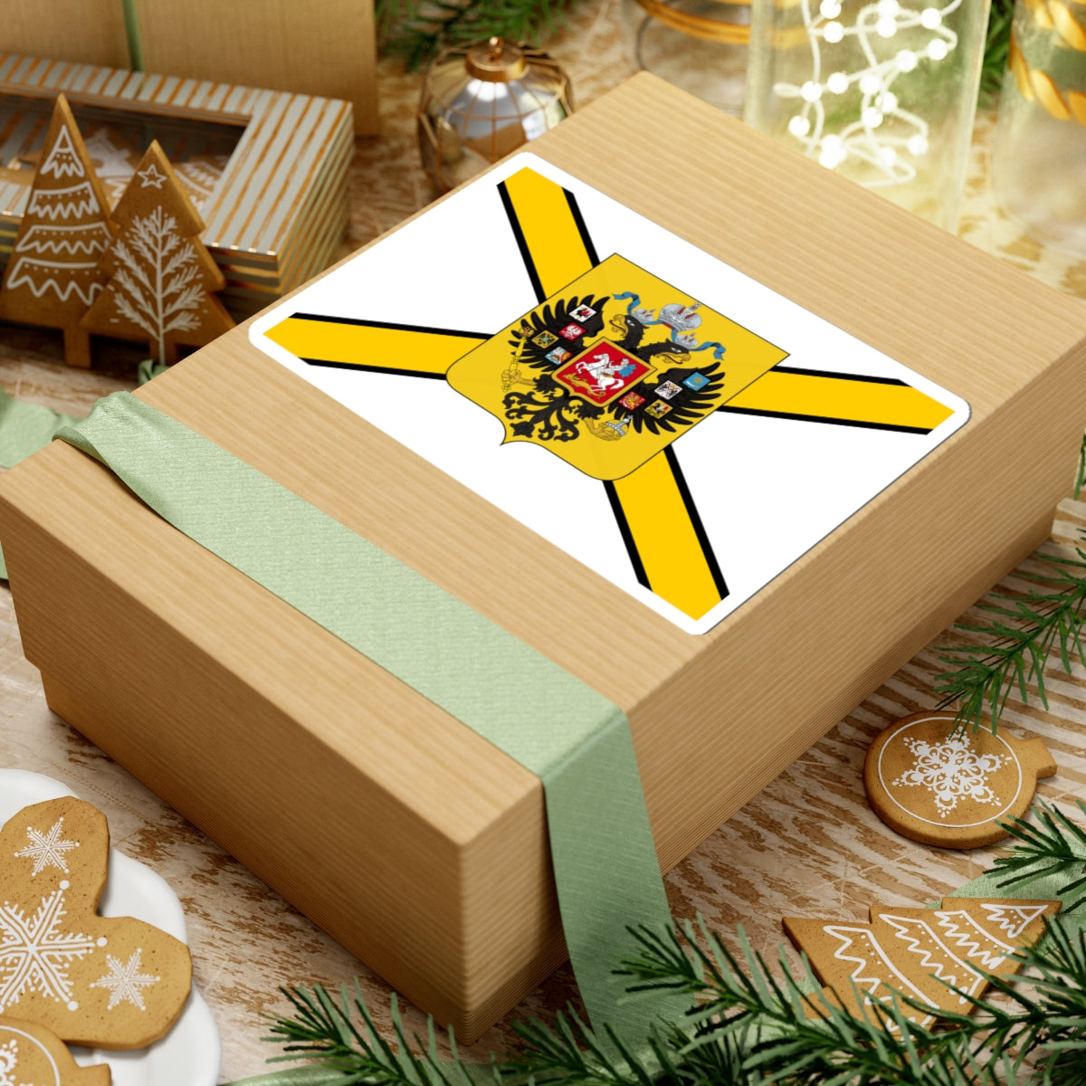 This vinyl kiss-cut decal features a striking design inspired by the historical symbolism of Imperial Russia, presented in a bold and eye-catching manner. The artwork centers around a flag design dominated by three horizontal stripes: black, yellow (or gold), and white. These colours hold deep historical significance, echoing the "imperial colours" of the Russian Empire, officially recognized in the 19th century.