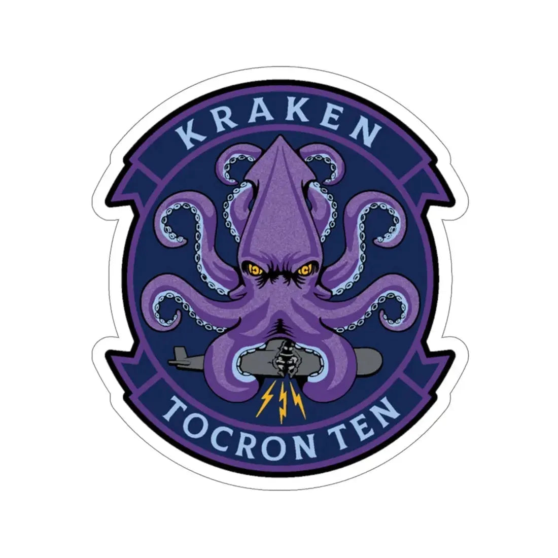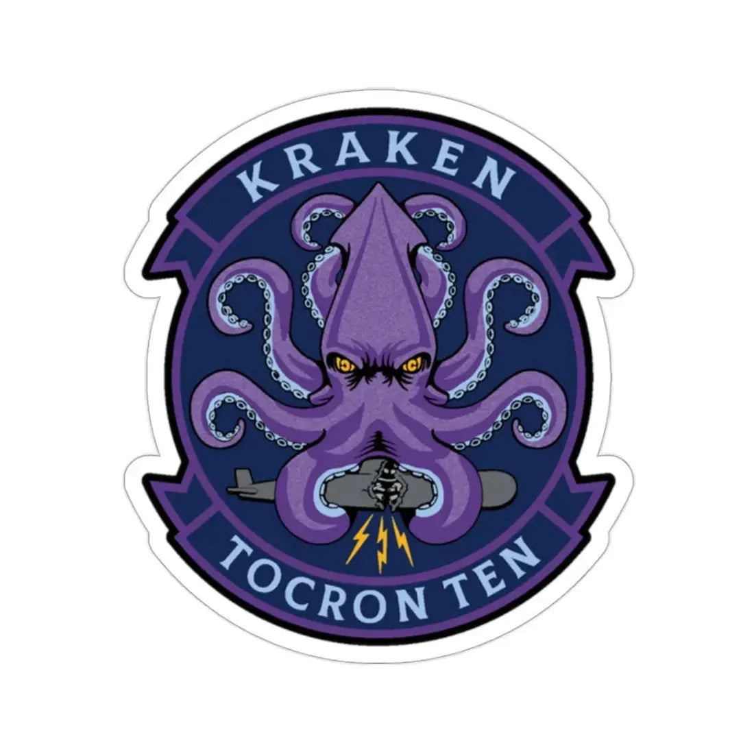 The design of the TOCRON TEN KRAKEN sticker is a visual embodiment of the Tactical Operations Control Squadron 10, a specialized unit within the U.S. Navy. The artwork prominently features "The Kraken," the squadron's formidable nickname, symbolizing its global reach and operational power.